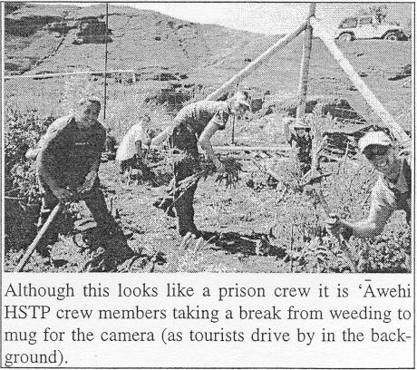 Upcoming trips (tentative) 1 -' Awehi (Lana'i; weeding, native plant outplanting; second week in August): Thanks to the success of the recent 'Awehi trip (see trip summary below), HSTP has been asked back. Lodgings will be relatively cushy and not at all in the backcountry. For information, contact Jackson Bauer: jbauer@alumni.hpu.edu