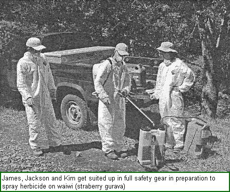 The group donned Tyvek suits, nitrile gloves, backpack sprayers and goggles to apply Remedy (herbicide) to waiwi and Myrica faya using the basal bark treatment method. For larger diameter trees, trunks were frilled and girdled with chainsaws or machetes to encourage herbicide uptake and quicker plant death.